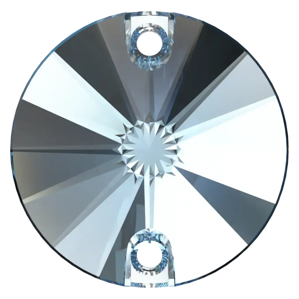 Swarovski sew on crystals Rivoli (3200) in Crystal AB are loose flat backed crystals that come with a thread hole, enabling the crystals to be sewn onto fabric. Swarovski Rivoli shaped crystals are cut glass crystals that have specifically cut facets which lead to a point. They are foiled on the underside of the crystal to reflect the light and enhance the colour of the stone.