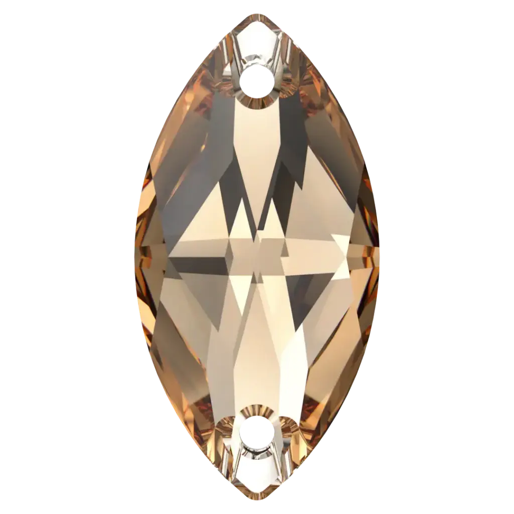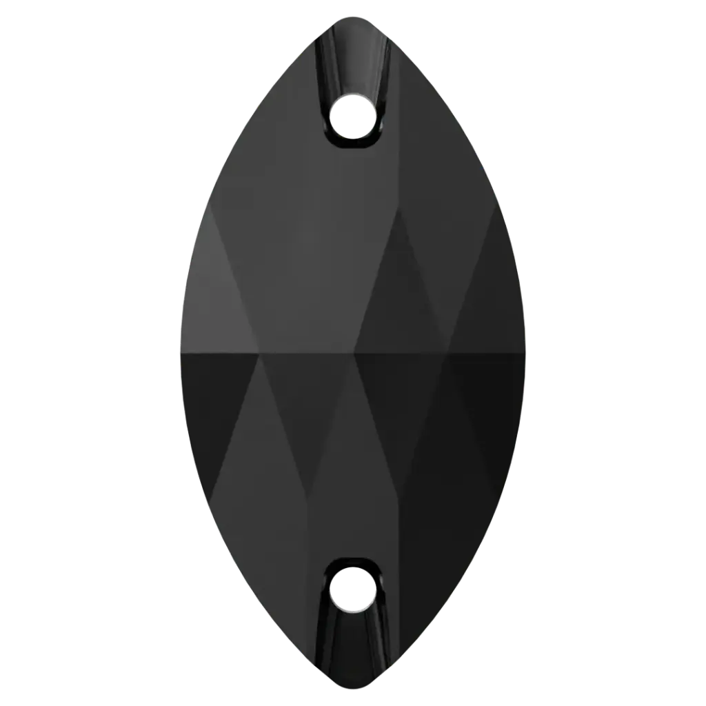 Swarovski sew on crystals Navette (3223) in Crystal are loose flat backed crystals that come with a thread hole, enabling the crystals to be sewn onto fabric. Swarovski Navette shaped crystals have an elongated, oval shape with pointed ends that resemble a small canoe or a leaf. They have a flat top surface and bevelled edges that create a multi-faceted effect, giving them a sparkling and radiant appearance.
